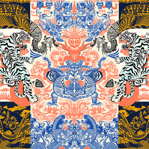 イラストはクールな対称的なデザインで、トーテムポールが貔貅の顔を強調し、保護と天の祝福を象徴しています。その周囲には、卓越性、神の力、富、強さを表す古代中国の虎、鳳凰、龍のモチーフがあります。